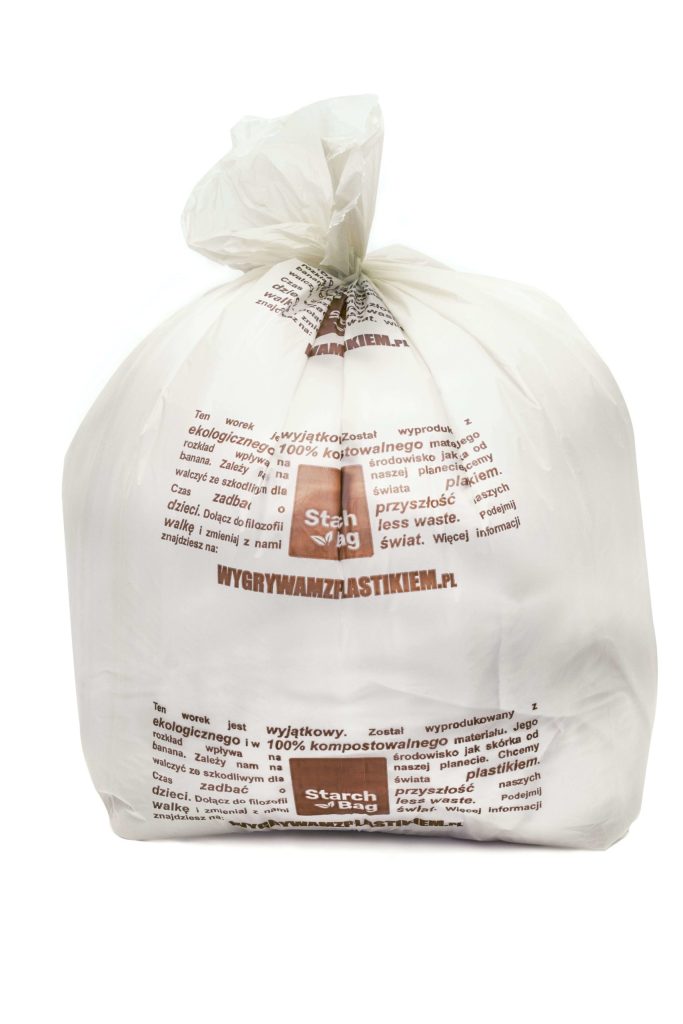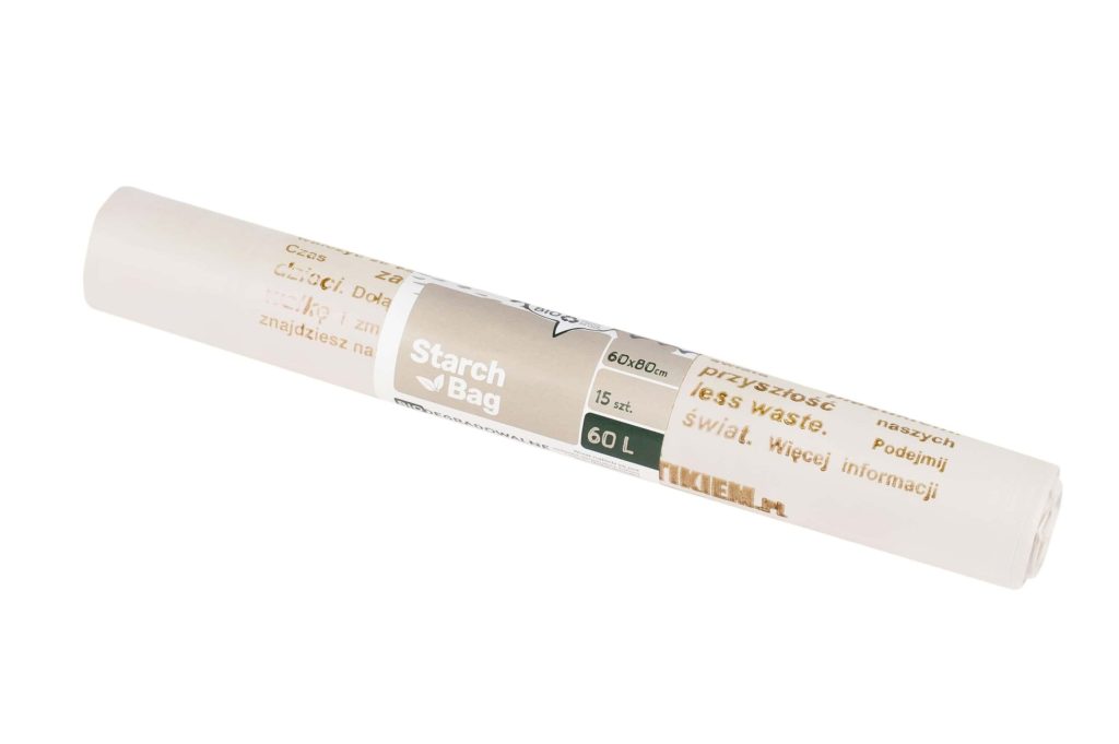 Owoc naszej pracy, średniej wielkości ekologiczne w pełni biodegradowalne i kompostowalne worki na śmieci, wyprodukowane w Polsce ze skrobi kukurydzianej posiadającej certyfikat OK Compost Home.